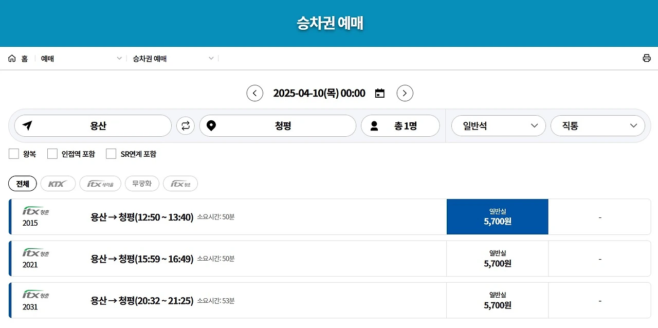 운행 구간: 용산역 ↔ 춘천역 (약 68분 소요)